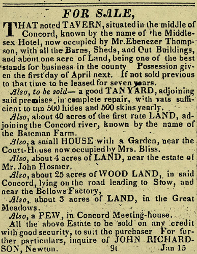 That noted TAVERN, situated in the middle of Concord, known by the name of the Middlesex Hotel, now occupied by Mr. Ebenezer Thompson, with all the Barns, Sheds, and Out Buildings, and about oneacre of Land, being one of the best stands for business in the county. Possession given the first day of April next. If not sold previous to that time to be leased for seven years.
