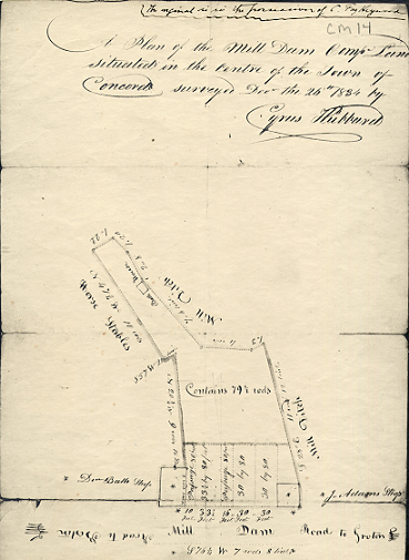 "Plan of the Mill Dam Comp. land situated in the centre of the Town of Concord surveyed Dec. the 25th 1834 by Cyrus Hubbard."