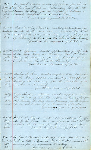 Page from the bound volume containing records of the use (1851-1923) of Concord's Town Hall