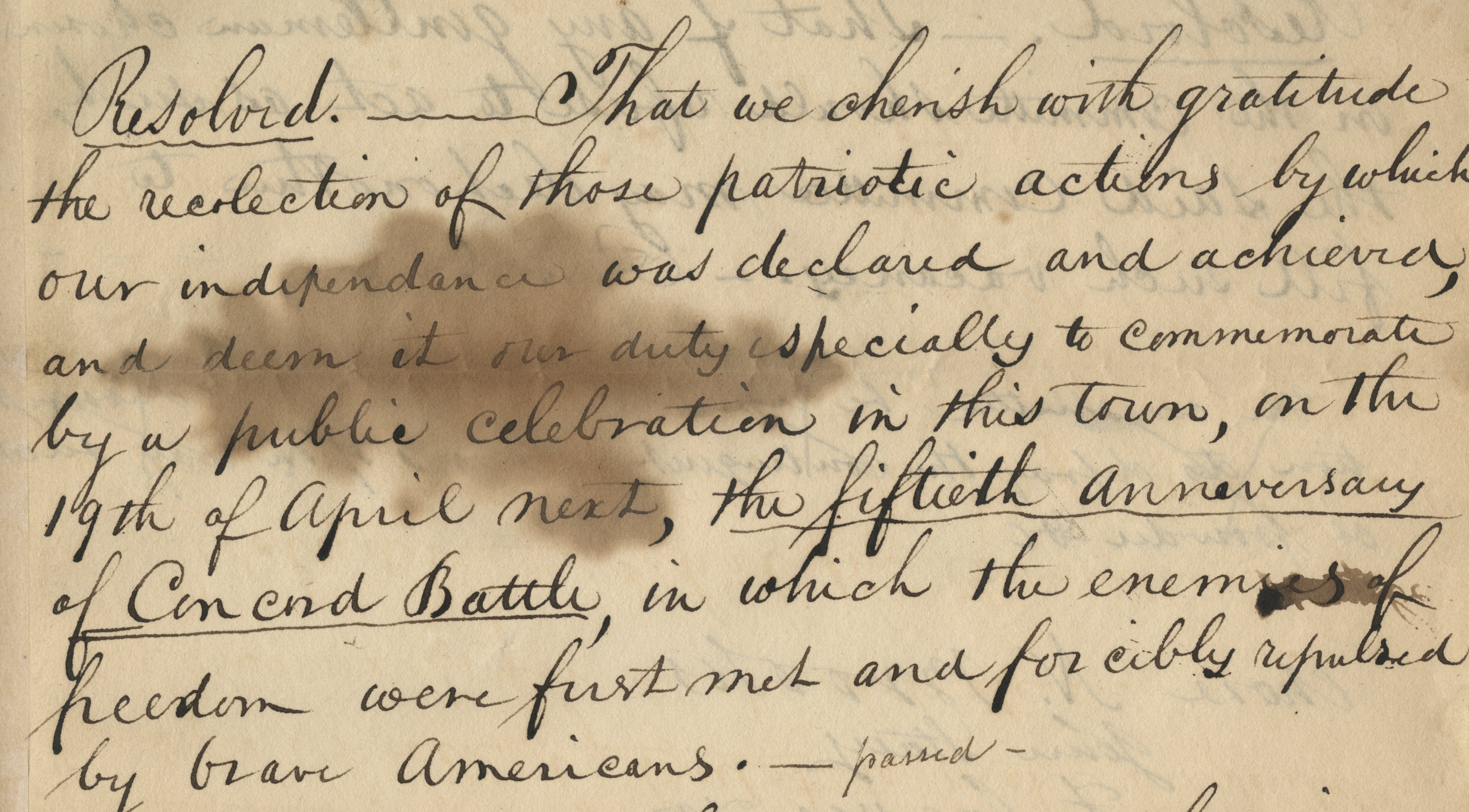 Resolved -- That we cherish with gratitude the recollection of those patriotic actions by which our independence was declared and achieved, and deem it our duty specially to commemorate by a public celebration in this town, on the 19th of April next, the fiftieth anniversary of Concord Battle, in which the enemies of freedom were first met and forcibly repulsed by brave Americans -- Passed.