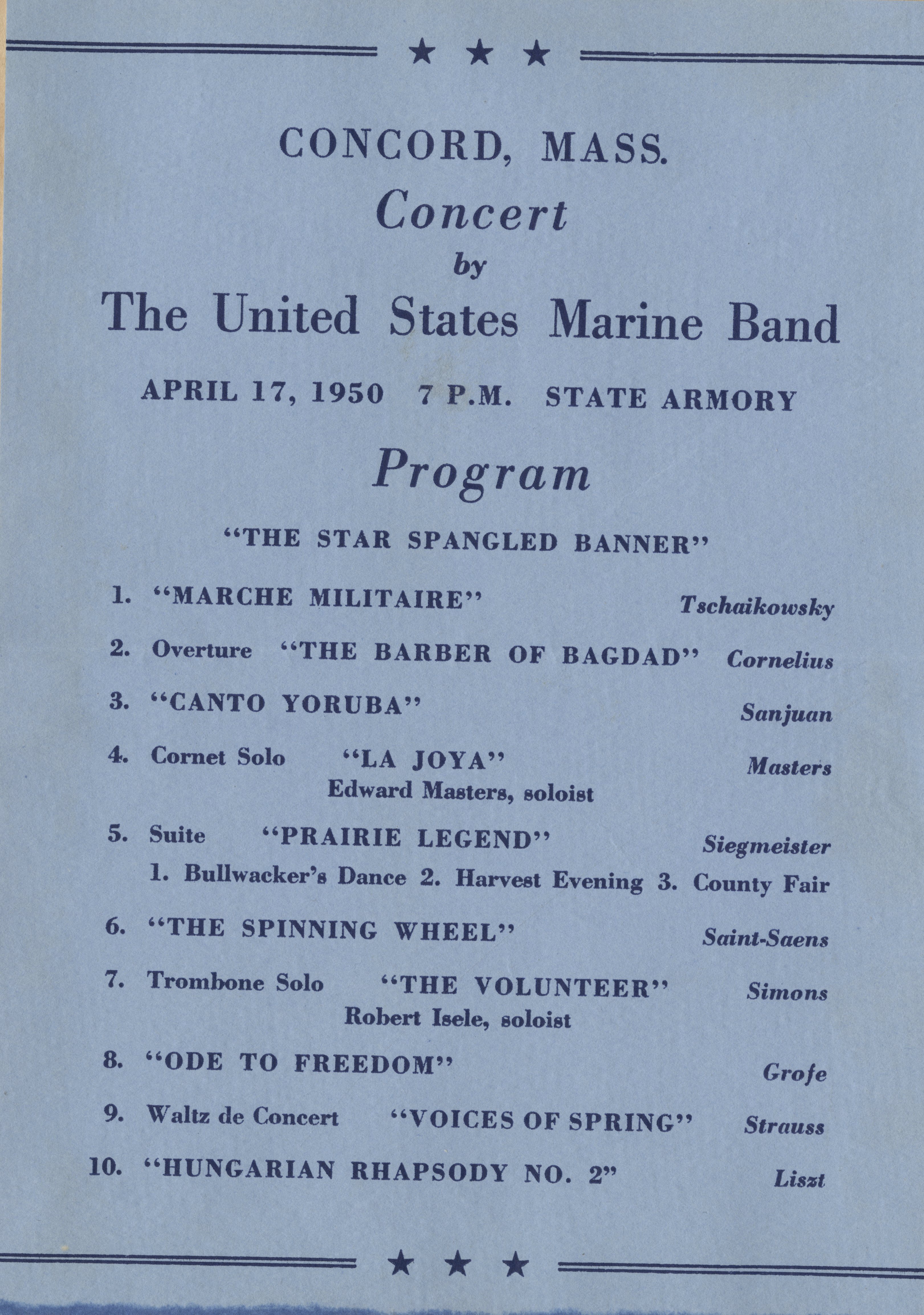 “Marine Band (1950),” William Munroe Special Collections at the Concord Free Public Library, accessed December 17, 2025, https://www.sc.concordlibrary.org/items/show/5305.