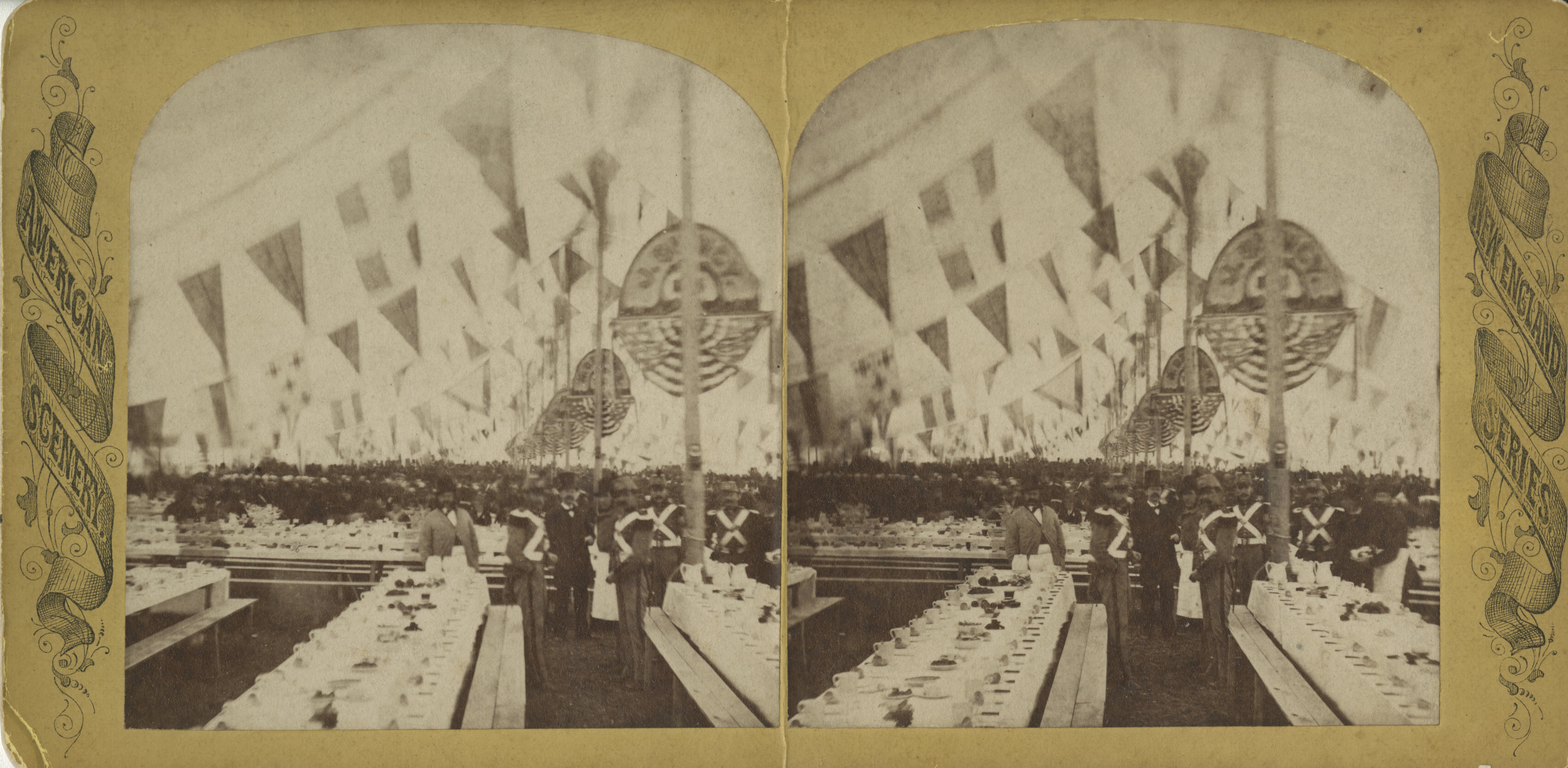 Image description: A black-and-white stereograph of the inside of the dining pavilion. The tent is decorated with flags. Tables set with dishes and food are visible, as are groups of people socializing in the background.