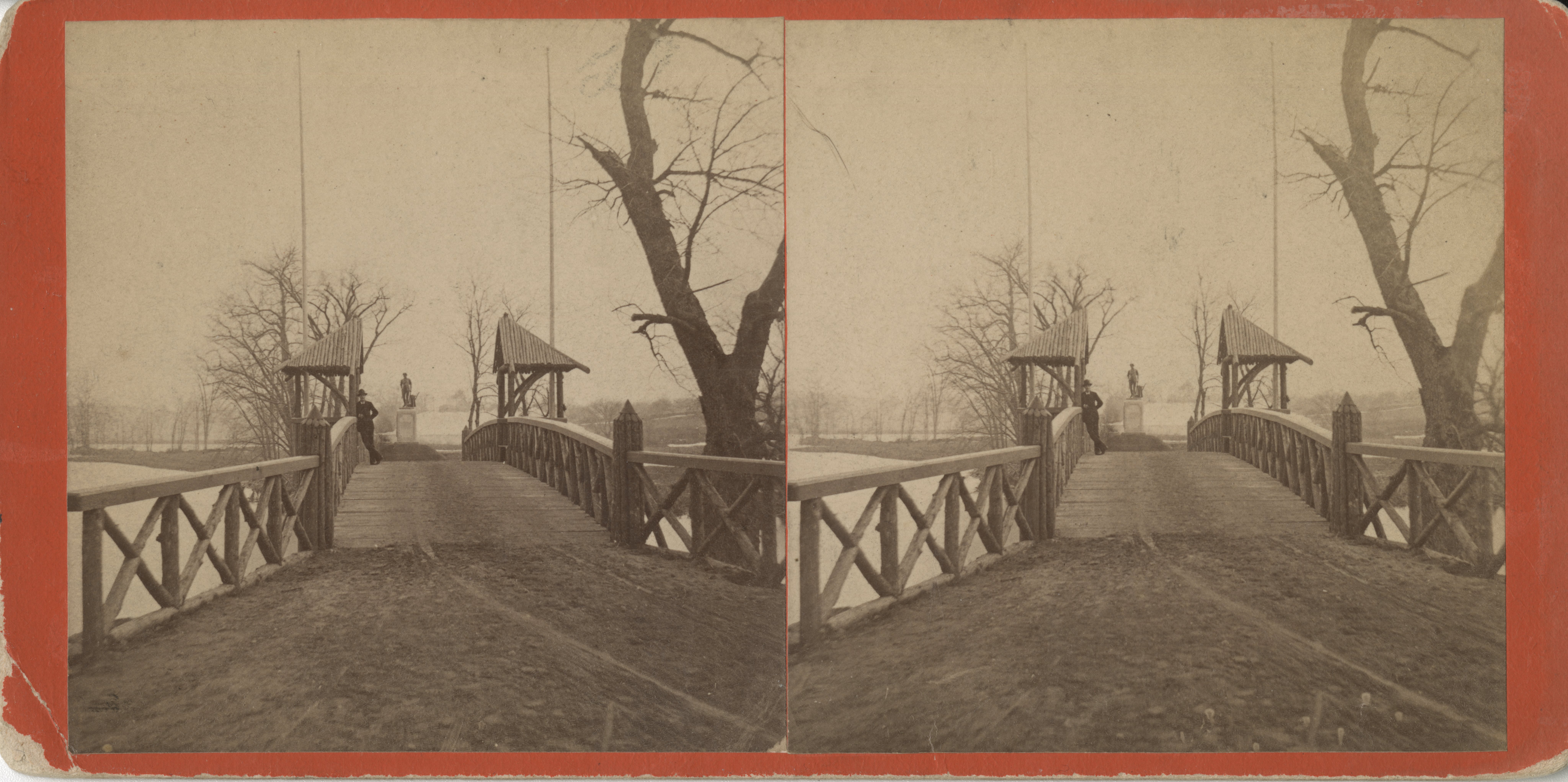 Image description: A black-and-white stereograph of the North Bridge with the Minute Man statue visible in the background. A man poses on the left side of the bridge.
