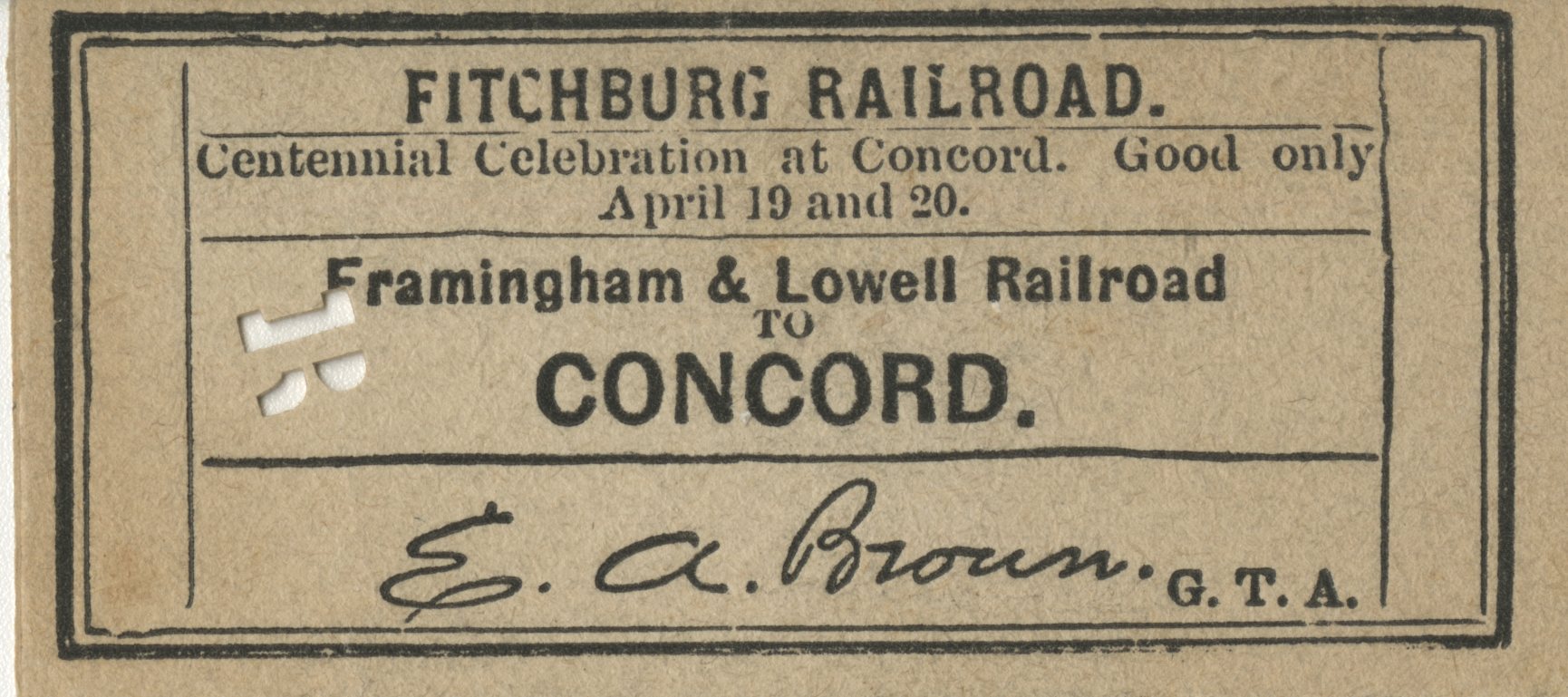 Image description: A beige railroad ticket with a small "R" punched out from the left side. Black text reads: "Fitchburg Railroad. Centennial Celebration at Concord. Good only April 19 and 20. Framingham & Lowell Railroad to Concord. E. A. Brown. G. T. A."