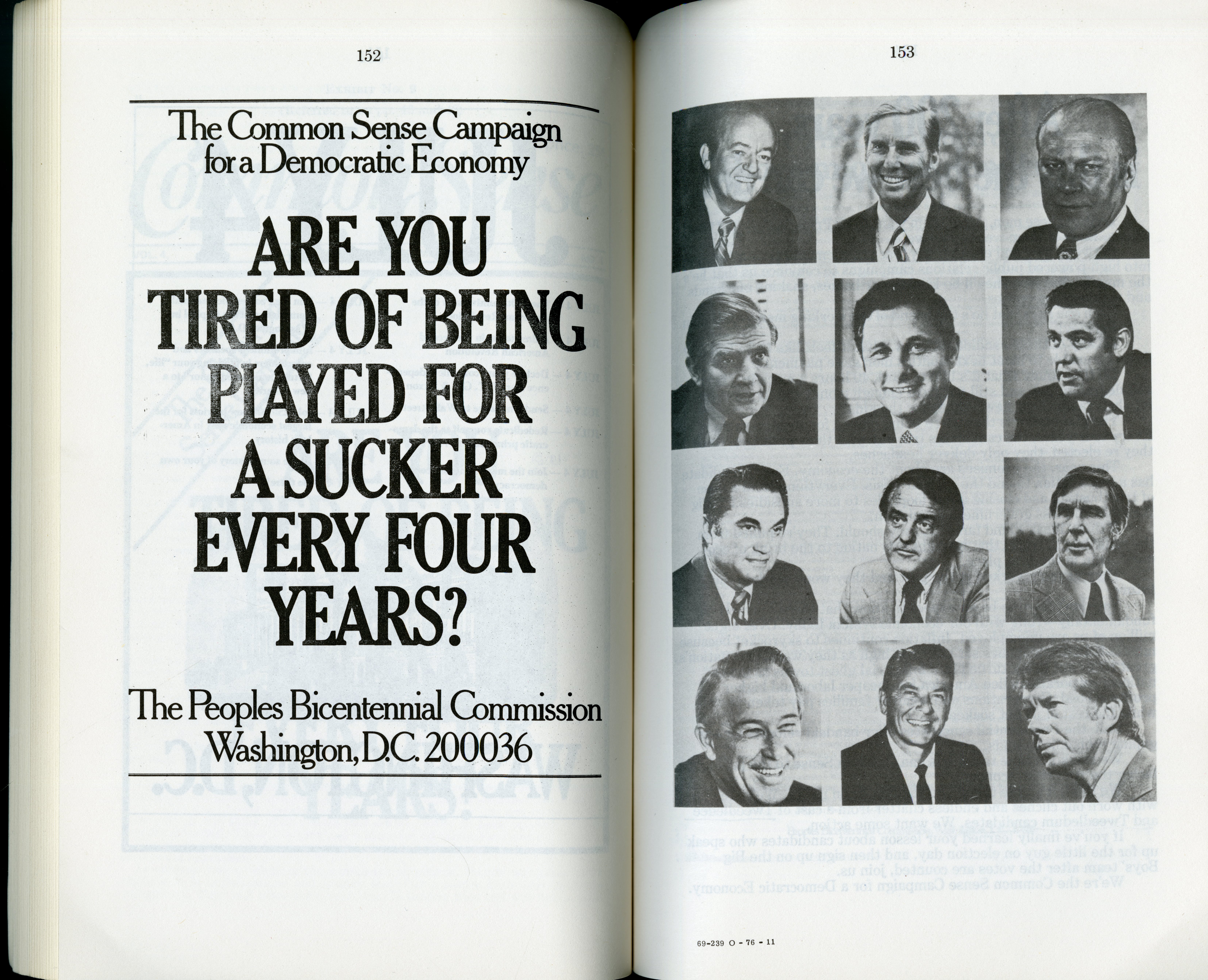 Image description: A two-page, black-and-white spread of an ad printed in the PBC's newspaper, Common Sense. The image on the left reads: "The Commo Sense Campaign for Economic Democracy. Are you tired of being played for a sucker every four years? The Peoples Bicentennial Commission. Washington, D.C. 200036. The image on the right shows 12 black-and-white headshots of various politicians, including Gerald Ford, Ronald Reagan, and Jimmy Carter.