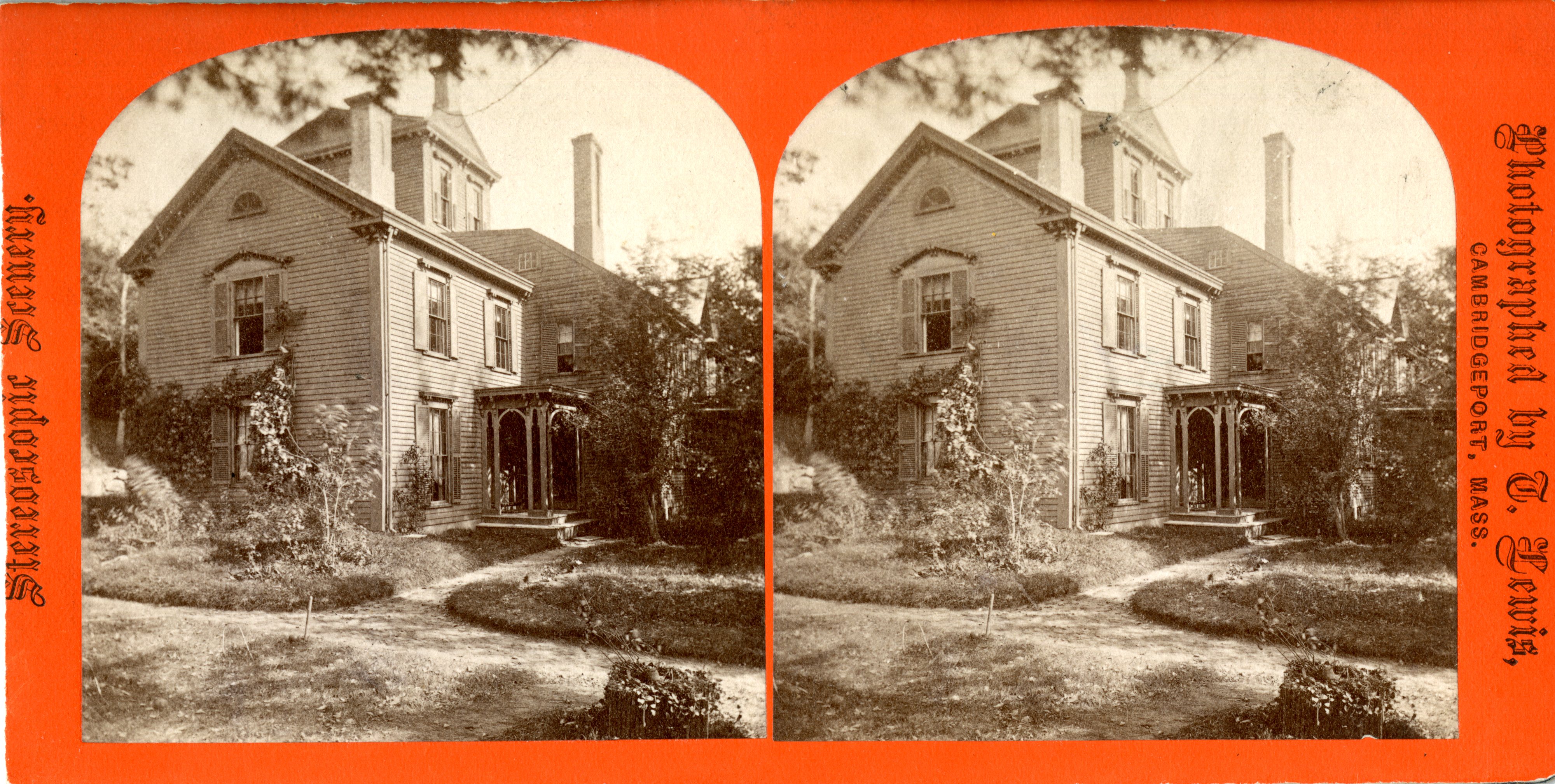 Image description: A black-and-white stereoscopic photograph of the Wayside, taken from the side. A small path leads up of a back door with a small covered porch. A portion of the house's top floor and three chimneys are visible. The wall is partially covered by ivy.