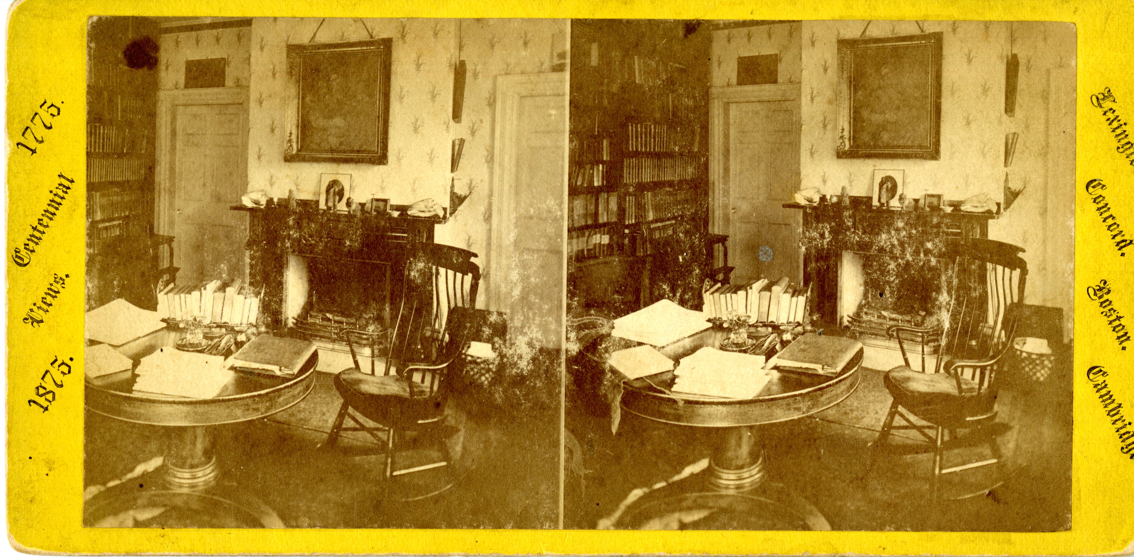 Image description: A black-and-white stereoscopic photograph showing a portion of Ralph Waldo Emerson's study. A round table and chair sit in the foreground with piles of books and papers on the table. Behind the table is a fireplace with a decorated mantle and a painting hanging on the wall above it. In the background is the door and a bookshelf.