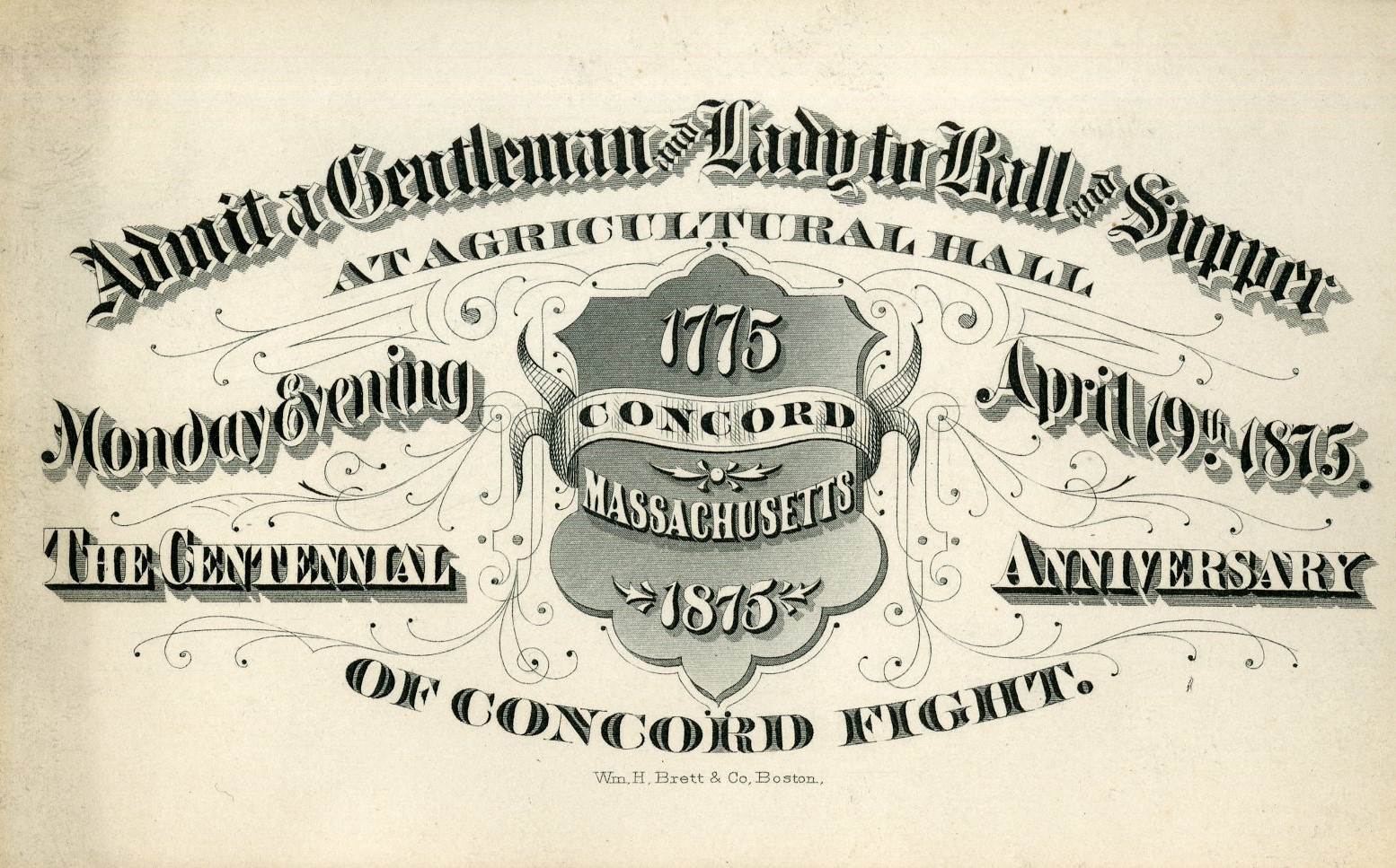 Admit a Gentleman and Lady to Ball and Supper at Agricultural Hall. Monday Evening April 19th 1875. The Centennial Anniversary of Concord Fight. 1775 Concord Massachusetts 1875.