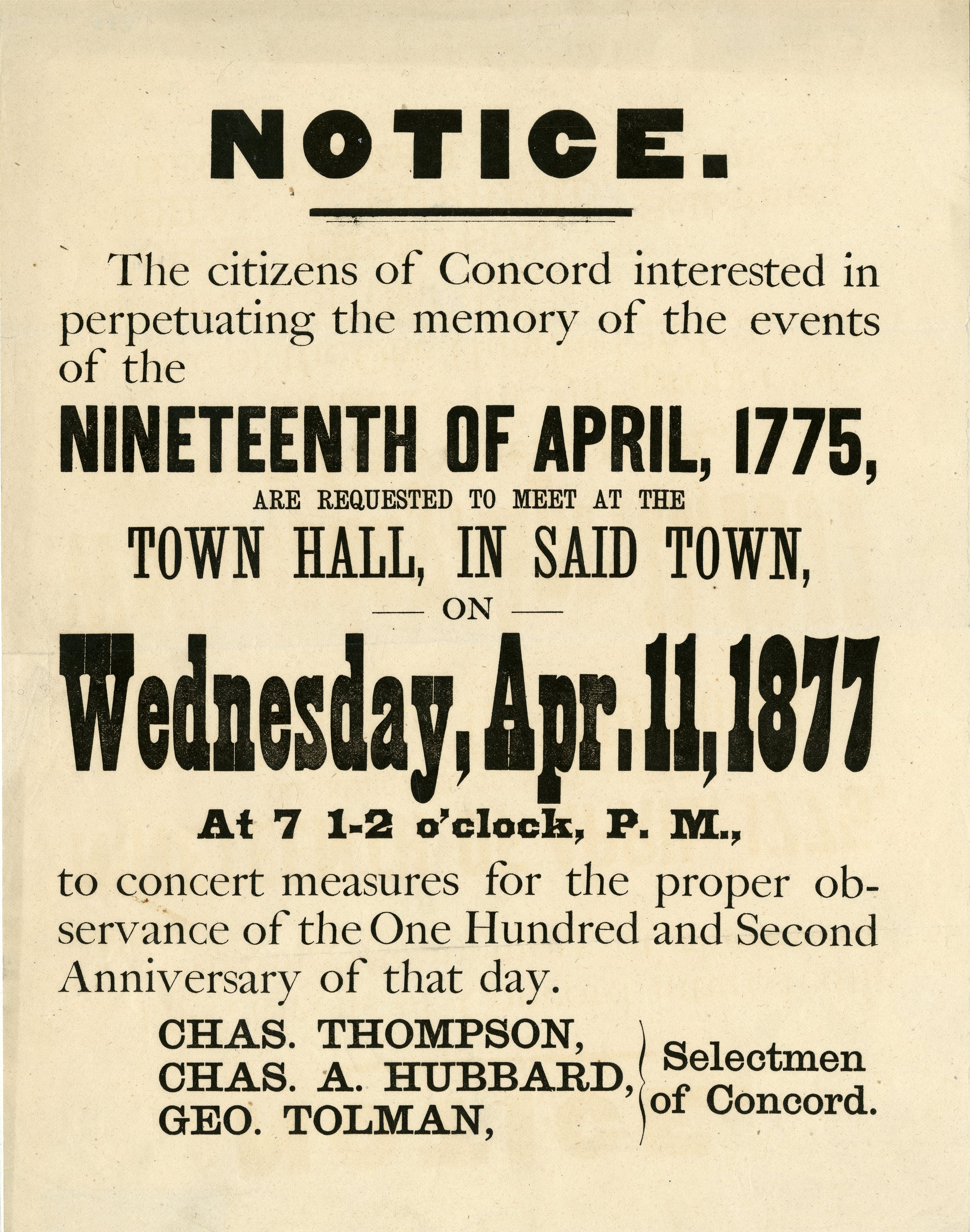 The citizens of Concord interested in perpetuating the memory of the events of the Nineteenth of April, 1775, are requested to meet at the Town Hall, in said town, on Wednesday, Apr. 11, 1877 at 7 1-2 o'clock P.M., to concert measures for the proper observance of the One Hundred and Second Anniversary of that day.
