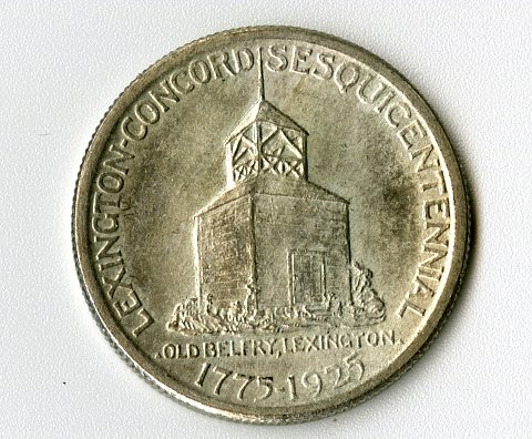 Image description: A round silver coin. In the center is Lexington's Old Belfry. Below the belfry is text reading "Old Belfry, Lexington." Text around the edge of the coin reads "Lexington-Concord Sesquicentennial 1775-1925."
